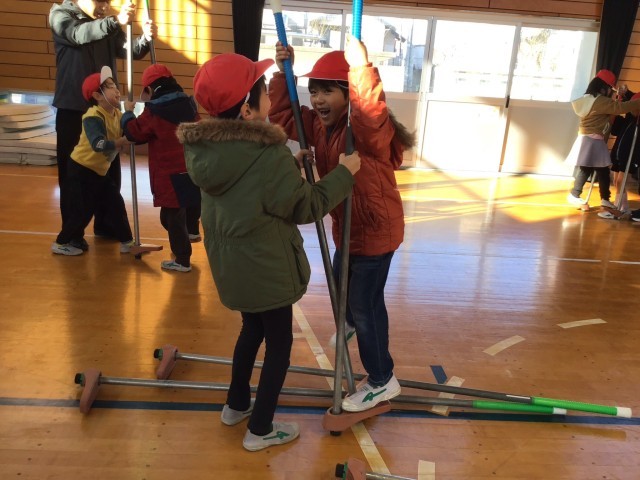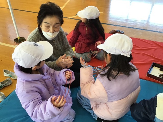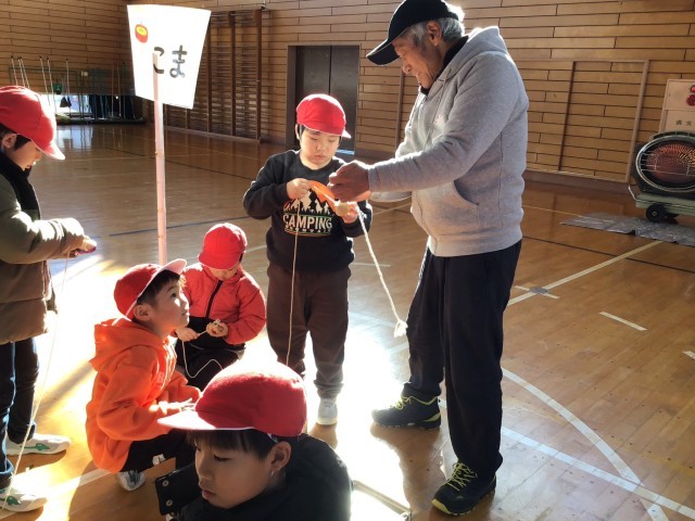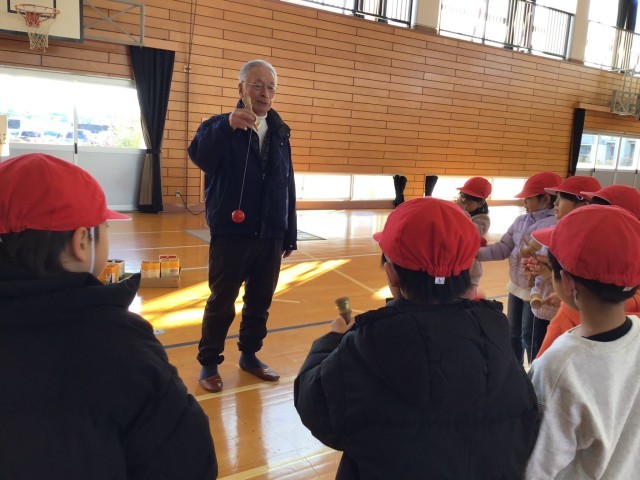 お手玉、あやとり、けん玉、こま、竹とんぼ、竹馬を地域の方に教えていただきました。子どもたちははじめてあそぶものがたくさんありました。冬休みにお家でもぜひ遊んでみてね。