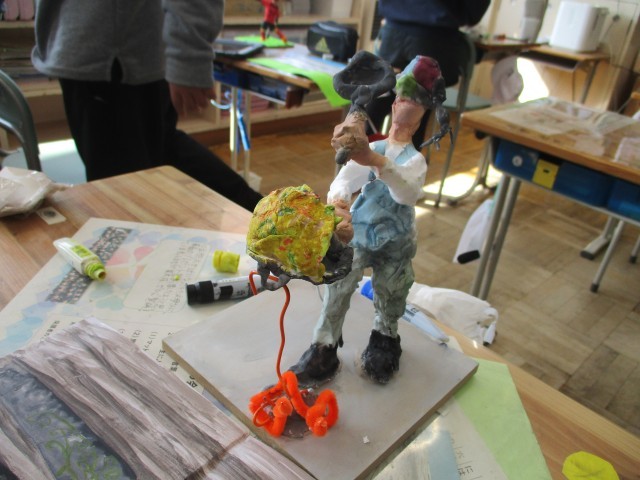 6年生は図工の勉強で未来の自分を紙粘土で表現していました。