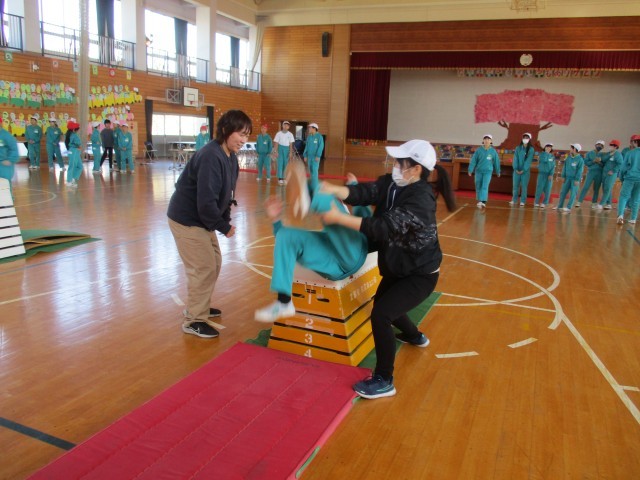 担任の先生に支えられながら跳び箱を飛ぶ。