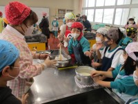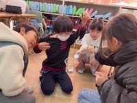 3年2組では算数で授業研究を行いました。まるい形を調べよう。円の仕組みです。バケツに紅白玉を入れるゲームで、みんなが公平に投げることができるにはどうすればいいか。バケツを置く中心から同じ距離の位置から投げられるようにする。つまり、中心、半径、円周の関係の勉強。子どもたちはものさしやメジャーを使って測るところまでは考えつきますが、その測り方にギャップが。あ~でもない、こ~でもないと試行錯誤しながら、相談し合いながら、何とか解決までたどり着きます。出来上がったお手玉はきれいな円になりました。机上の勉強ではなく、体と頭とコミュニケーションをフルに活用した楽しい勉強でした。