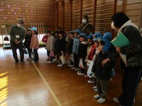 南東北こども園の園児の皆さんが学校見学に来ました。体育館や家庭科室、1年生の教室...