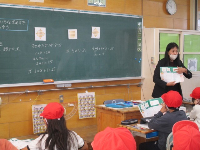 4年生では算数の研究授業をやりました。ドット図をもとに、数のまとまりに着目して1つの式にして数を求める授業すぁう。子どもたちはまとまりの数に目を向けていろいろな組み合わせをしていきます。まとまりの作り...
