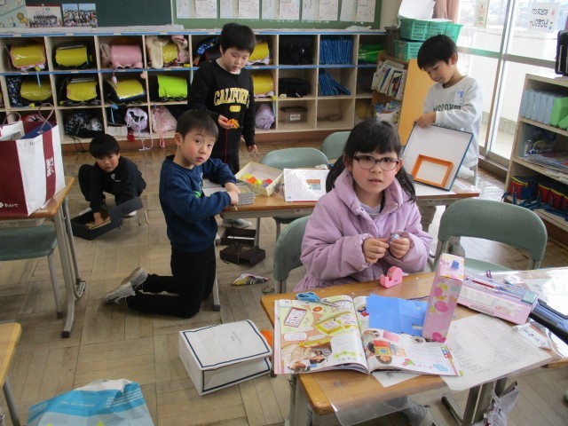 1年生は図工で自分の大切なものを入れる箱を作っていました。たいせつボックス。まあ、みんな一生懸命。集中して作成に取り組んでいます。やっぱり図工は楽しいんですね。