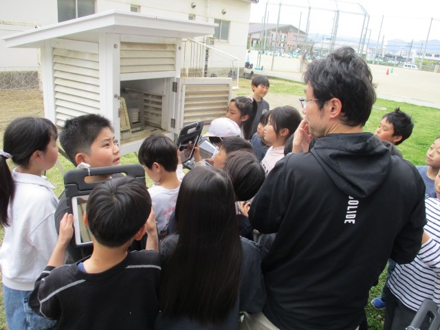 4年生は理科の授業で校庭の様子の観察です。あたたかくなって植物や昆虫も動き出してきました。校長室の前のテラスの隙間をタブレットで見るの中がのぞけることを発見。そして、中庭にある謎の道具「百葉箱」の中身...