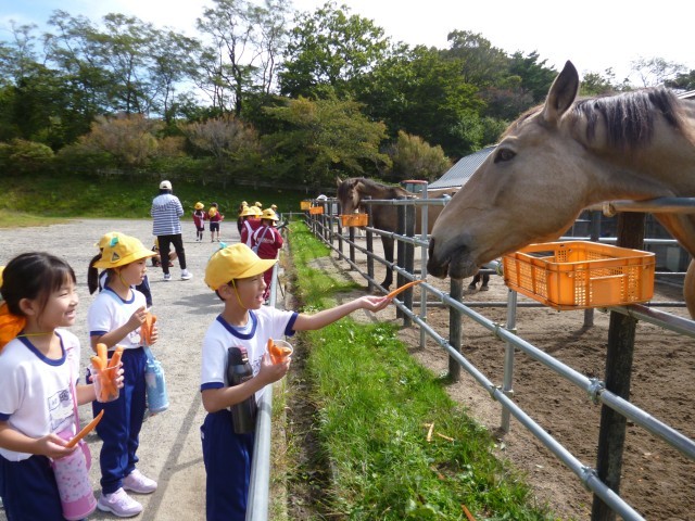 10月3日(金)に、1年生が見学学習で石筵ふれあい牧場に出かけました。馬やウサギなどの動物と触れ合ったり、遊具や広場で元気に遊んだりとても楽しい時間を過ごすことができました。