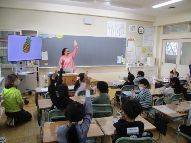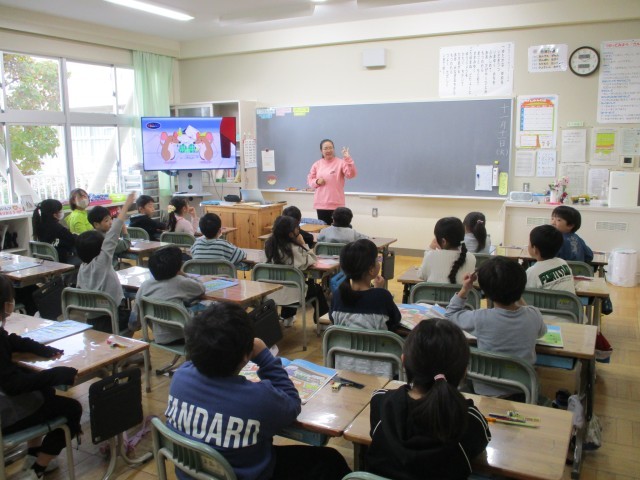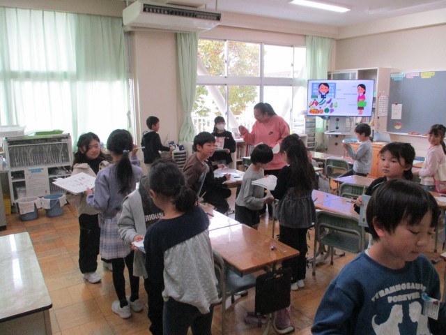 11月11日(火)に、AETのドナリン先生が来校し英語の学習を行いました。今回は、2年生と6年生が学習しました。2年生は、果物の英語での言い方を学習した後、八百屋さんとお客さんに分かれ、買い物場面での言い方の練習を行いました。