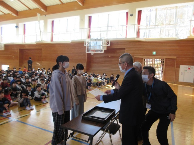 11月17日(月)に、芭蕉祭俳句大会の表彰式が行われました。代表児童に賞状が渡された後、優秀な作品のどのようなところが良かったのかや、どのようなことに気を付けて作ればいいのかどについて詳しくお話がありました。子供たちは早速、来年度に向けてどのような俳句を作ろうかと思案していました。