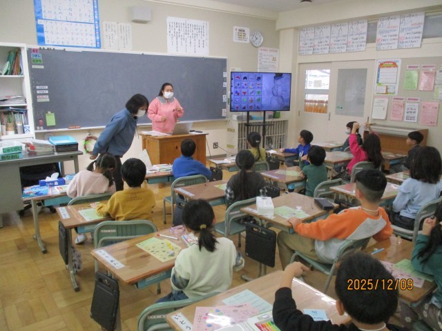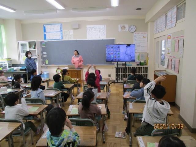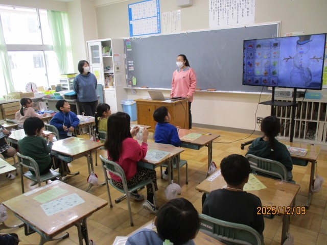 12月9日(火)にAETのドナリン先生が来校しての英語の学習が行われました。今回は、1年生、2年生、6年生で学習を行いました。1年生は、数字とアルファベットを使って雪だるまに飾りを付けるゲームを行い英語に親しみました。