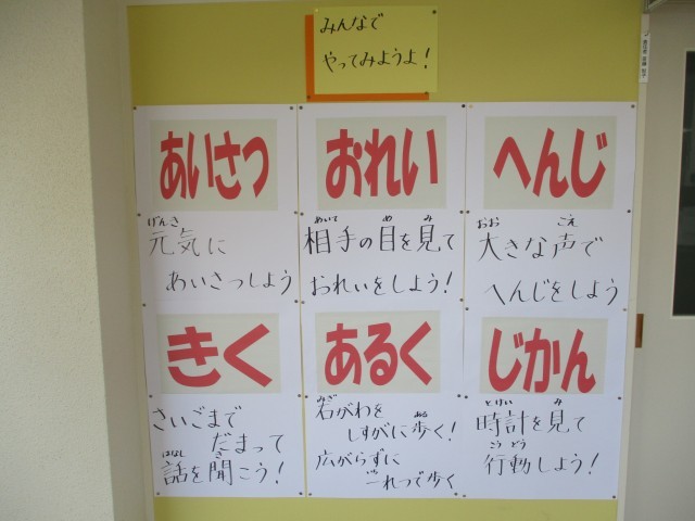 3学期の始業式で校長先生に頑張ってほしいことについて6つのお話がありました。「あいさつ」「おれい」「へんじ」「きく」「あるく」「じかん」この6つについてしっかり守って生活をすることが今の永盛っ子の約束になっています。教室や廊下に掲示してあり,それを見ながら子供たちは学校生活を送っています。ルールを守り,みんなが楽しく集団生活ができるように頑張っています。3学期,まとめの学期です。この6つの約束を守って,進学,進級に向けて頑張らせていきたいと思います。