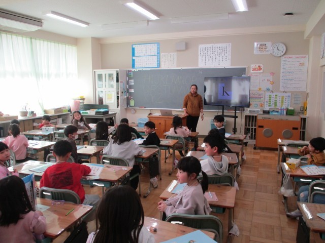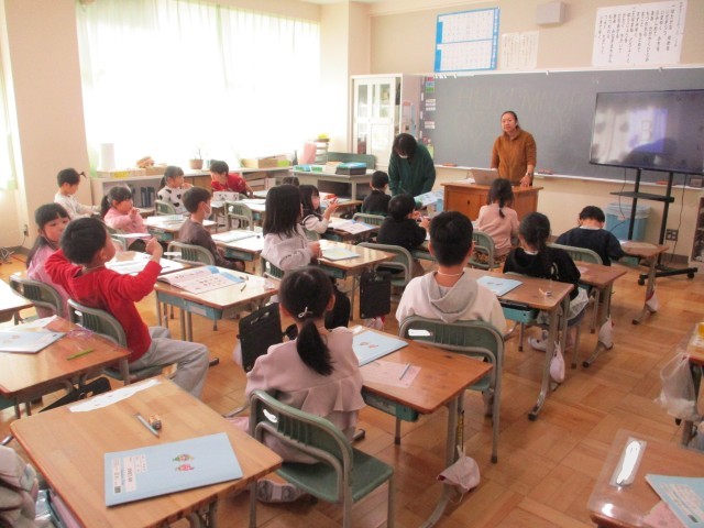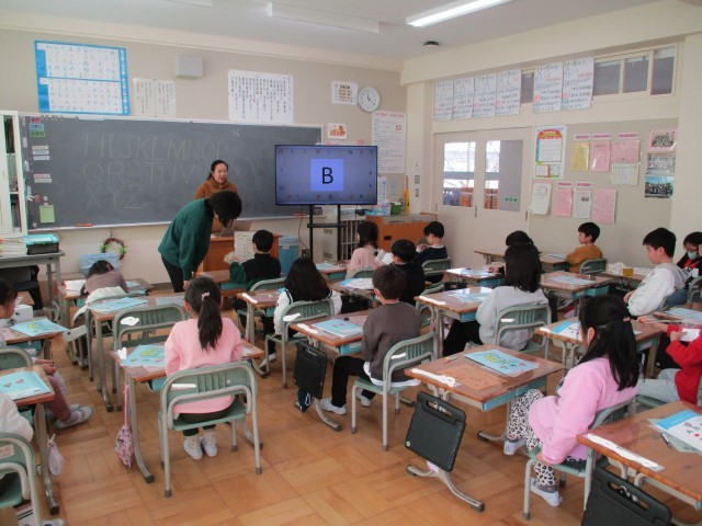 2月19日(木)に,AETのドナリン先生が来校しての英語の学習が行われました。今回は,1年生と5年生が学習を行いました。1年生は,大型モニターを見ながら,隠れているアルファベットを当てるゲームを行いました。アルファベットもだいたい覚えることができてきたようです。