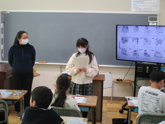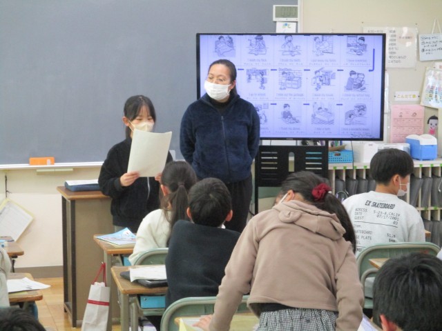 3月12日(木)に,AETであるドナリン先生が来校しての英語の学習が行われました。今回は,2年生と4年生が学習しました。4年生は,自分の1日の起床から就寝までの生活の流れを時系列にそって,英語で発表を行いました。とても上手に発表できていました。