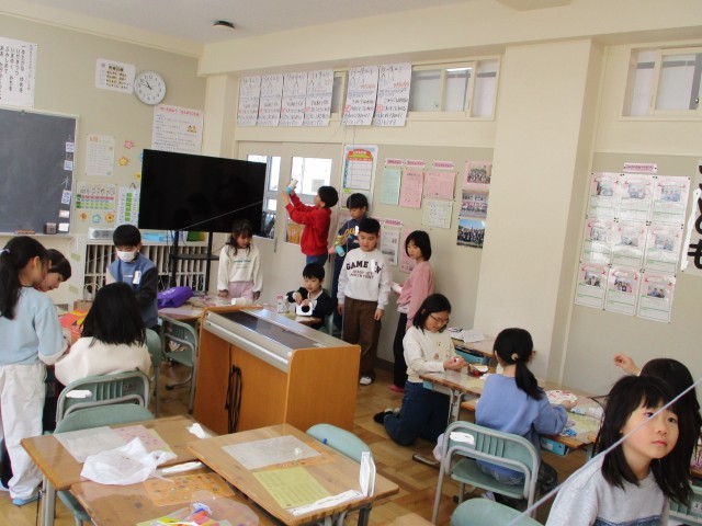 1年生は図画工作科で「スルスルビューン」を行っています。空き箱や紙コップで作った乗り物にゼムクリップを付けて,毛糸にセットし,スルスルと動かす活動です。とても熱心に活動していました。