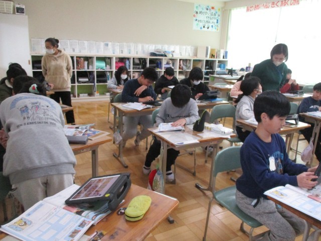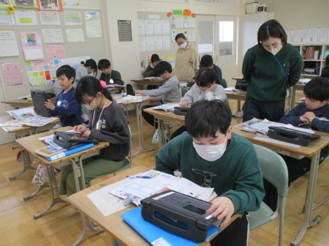 3月13日(金)にAETのドナリン先生が来校しての英語の学習が行われました。今回は,5年生と6年史が学習を行いました。5年生は,日本で紹介したい都道府県を紹介する英語の文章を作ることにチャレンジしました。どんなところなのか,どんな建物や自然があるのか,どんな食べ物があるのかなどを調べ,まとめていました。