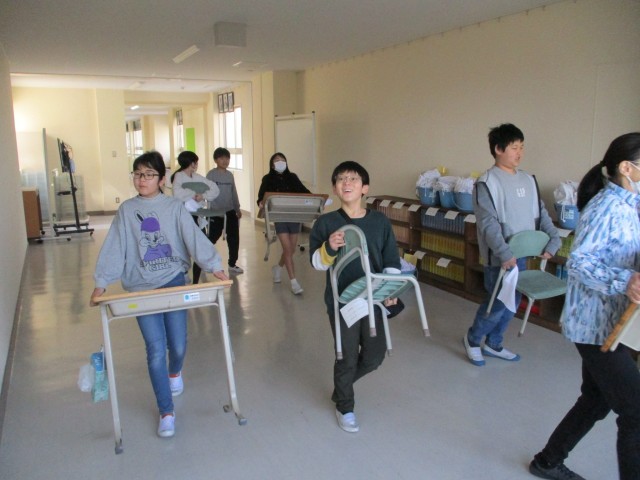 3月25日(水)に,新6年生(現5年生)による教室移動が行われました。23日の卒業式後,静かだった学校に子供たちの声が戻ってきました。子供たちの卒業,進級に伴う学習用具等のお引越しです。さすが新6年生。新学級に伴ういすや机の移動,各学級の清掃等も一生懸命に行っていました。