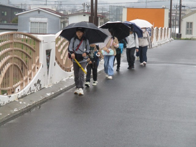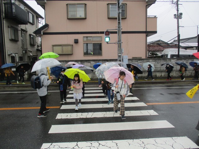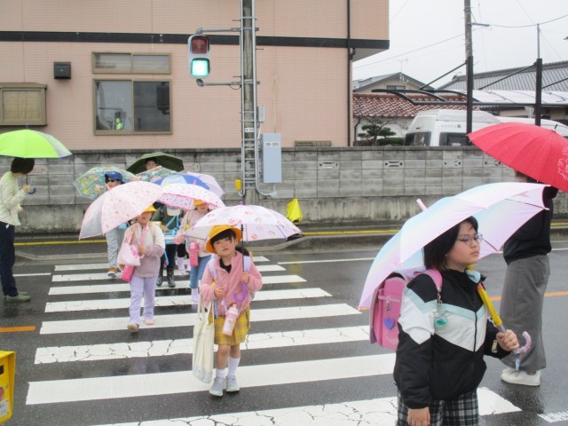 4月10日(金)の登校の様子です。あいにくの雨で,傘をさしていましたが,班長を先頭に1列になって登校する姿が見られました。傘をさしているためか,列が長くなり,信号を1度に渡ることができない班もありました。これからも交通ルールを守って安全に登下校してほしいと思います。