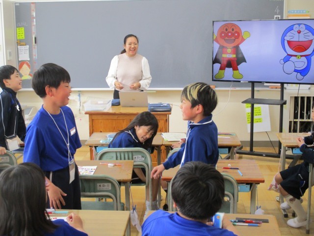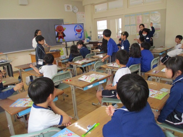 4月13日(月)に,AETのドナリン先生が来校しての英語の学習が行われました。今回は3年生が学習しました。ペアでアンパンマンとドラえもんになって自己紹介する練習を行いました。