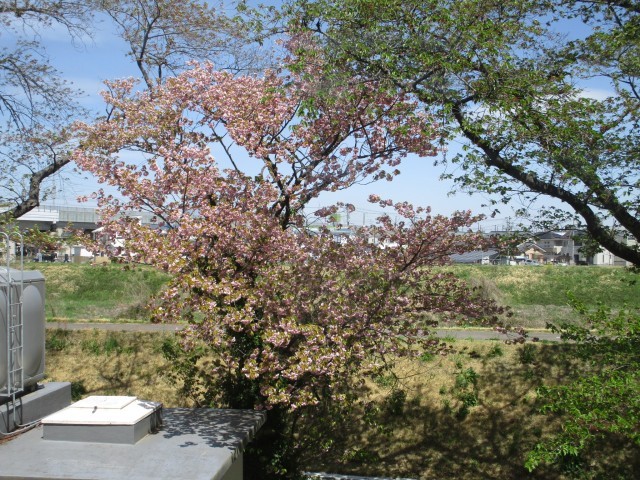 4月も下旬を迎え,桜前線は北海道に到着したようです。校庭の桜の花も散ってしまい葉桜になってしましましたが,校舎北側にあるカンザン(遅咲きの八重桜)が2本きれいに花をつけています。学校の窓からはまだ桜を楽しむことができます。