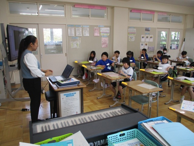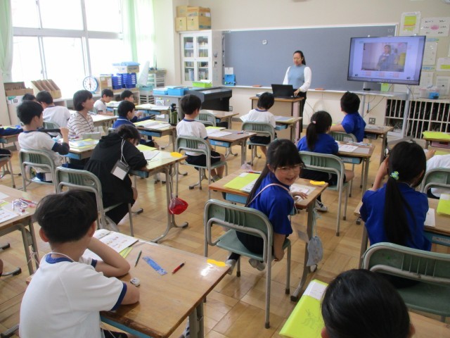 4月28日(火)にAETのドナリン先生が来校しての英語の学習を行いました。今回は,3年生と5年生が学習を行いました。3年生は,モニターのビデオを見ながら会話をする練習を行いました。