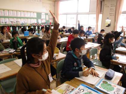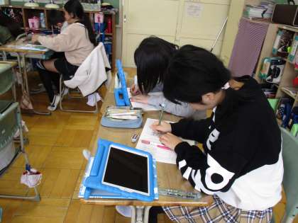 5年生、ipadで調べもの、調べたことを積極的に発表しています。6年生は3人グループでまとめた算数の課題を発表しています。