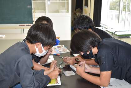 6年2組は、理科の大地のつくりの学習で火山灰の観察を行っていました。虫メガネを使い、粒の形や色などの特徴をまとめていました。