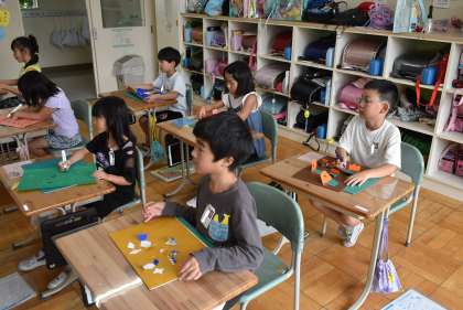 2年2組は、図画工作科で「まどからこんにちは」の製作を行っていました。カッターナイフで切り抜いた窓に、どのようなデザインをすればよいかを考えていました。