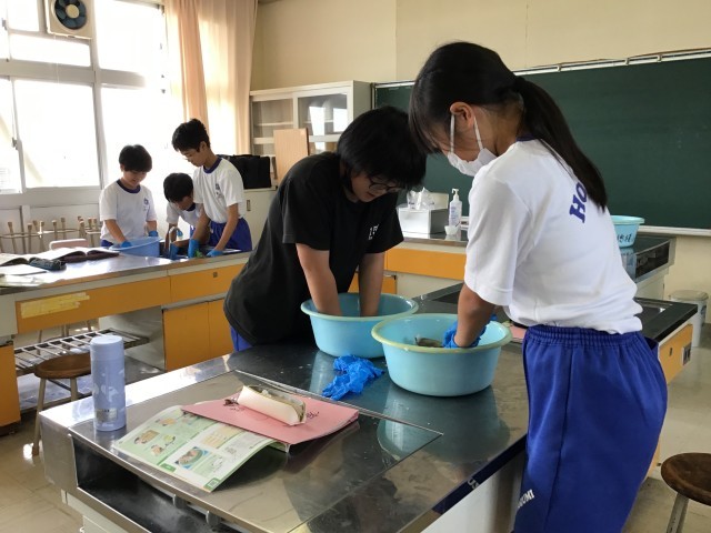 6年生は家庭科の洗濯実習で手洗いの学習を行なっています。