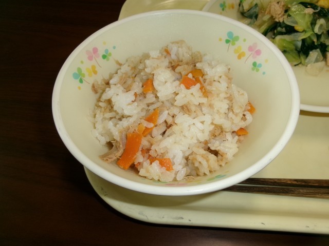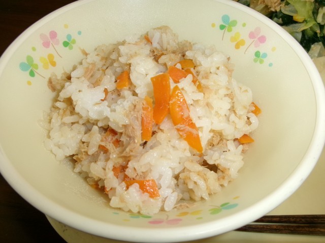 にんじんを短冊切りにして、ツナ缶と一緒に砂糖や醤油で味付けし、ご飯に混ぜ合わせていただきます。