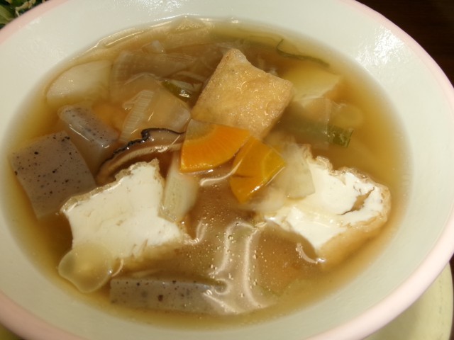 冷えた体を温める意味で、水溶きデンプンでとろみをつけた汁物です。具材には、干し椎茸にささがきゴボウ、にんじんと大根、里芋、長ネギ、さらにこんにゃくと生揚げとたっぷり入っています。