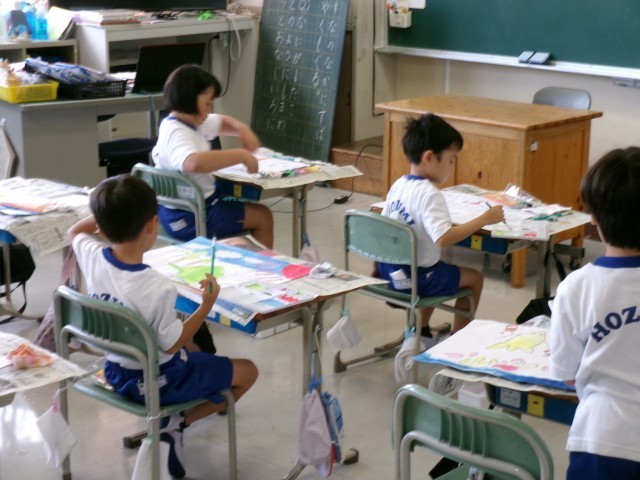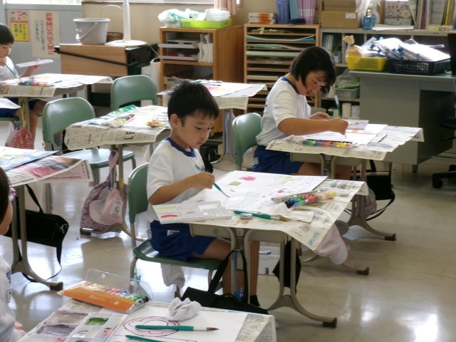 1年生 図画工作科の時間に自分の好きなことを画用紙いっぱいに大きく描き、絵の具で色をつけています。