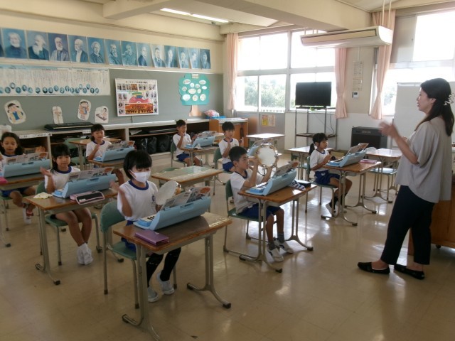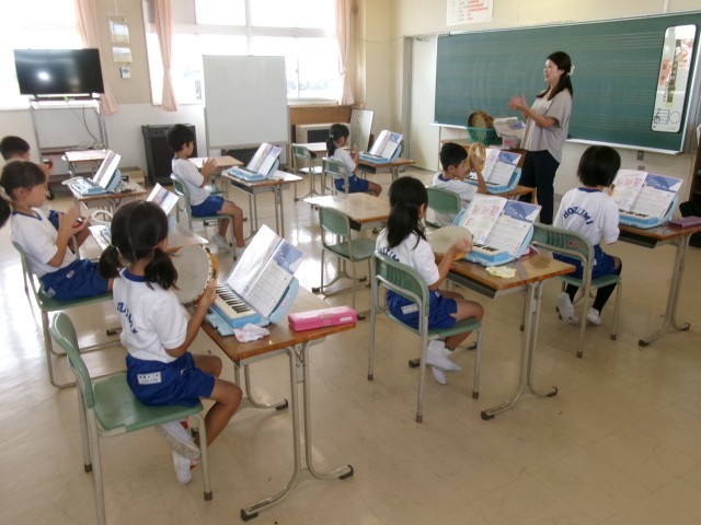 2年生 音楽の時間に音楽室で歌に合わせて、タンバリンやカスタネットを演奏しています。