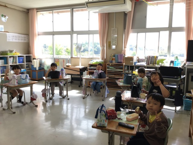 1年生教室では、楽しそうにみんなで美味しいお弁当を食べていました。