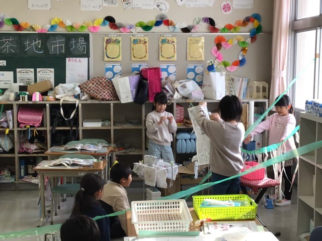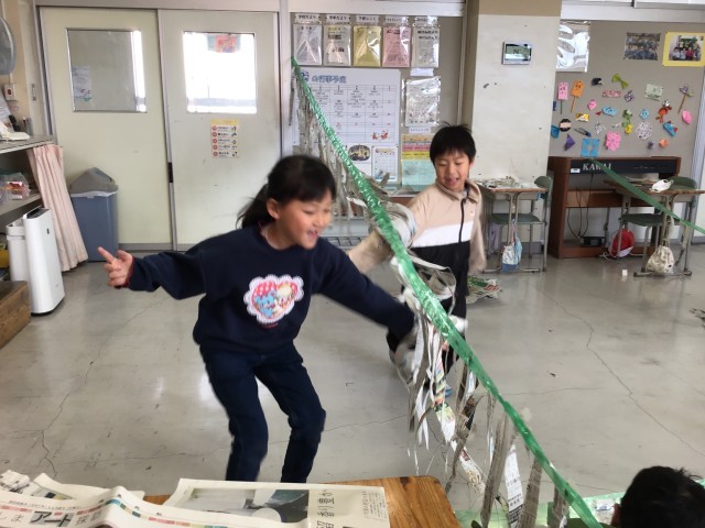 2年生の図工では、新聞紙をちぎってテープでとめて飾る「つないでつるして」の学習を行いました。