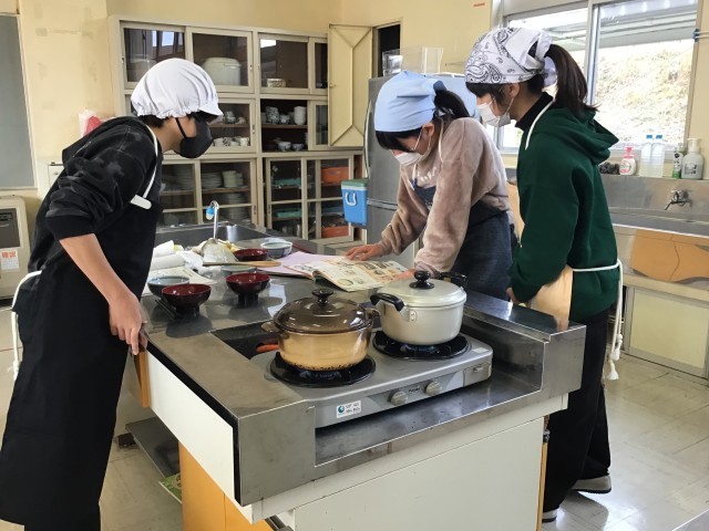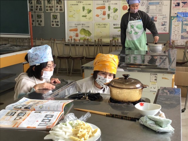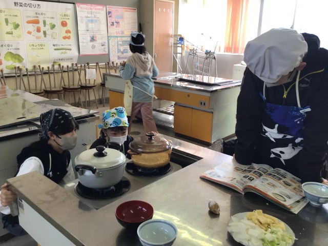 5年生は家庭科の学習で、ご飯と味噌汁を作りました。
