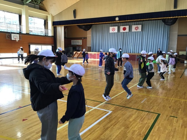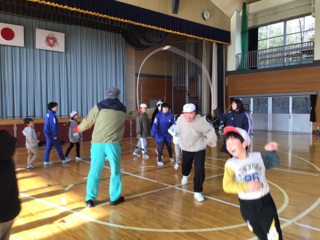 昼休みに、縄跳び記録会の団体種目、縦割り班の長縄跳びと上学年と下学年がペアで行うペア跳びの練習を行いました。