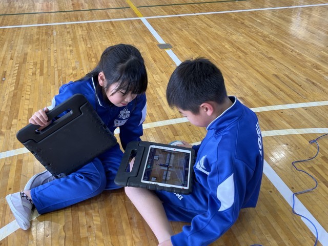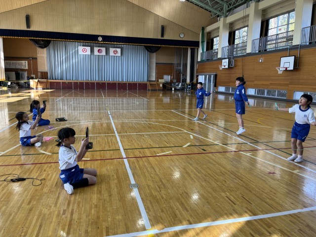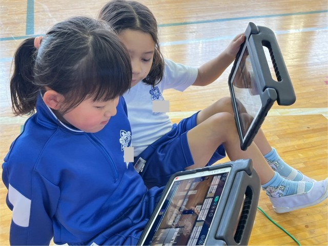 2年生は、体育の時間にiPadで自分がなわとびを跳んでいる動画を撮影してもらい、改善点を友達と話し合いました。