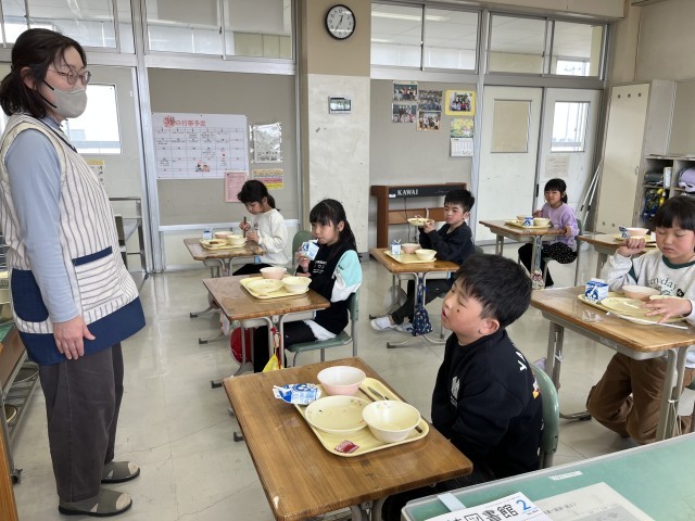 毎日給食の時間になると、給食の先生が全ての教室を回って子ども達の食べている様子を見たり、味の感想を子ども達に聞いたりしてくださっています。