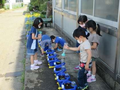 アサガオが発芽したのがとてもうれしいようで、1年生が毎朝水かけをしています。命あるものを大切にする心が育ちますね。