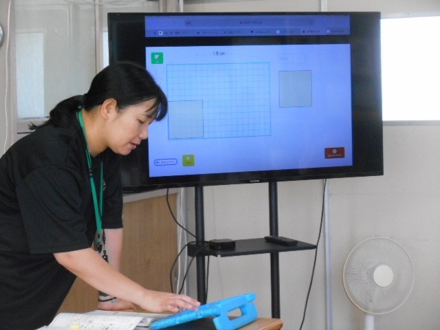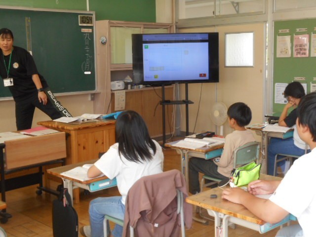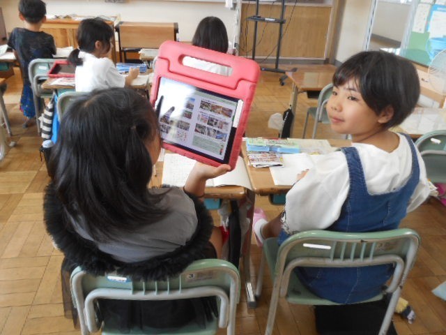 3年生は、社会科の「店はたらく人」の学習をしていました。広告やタブレットに入っている資料を見ながら仲良く学習していました。5年生は、算数の学習です。約数と公約数の学習をしています。本時はデジタル教科書が大活躍の学習です。昔は、先生が黒板に模造紙を貼って提示したり、子どもたちは紙をワークシートに貼ったりしながら学習していました。今は、タブレット端末で操作しながら学習をすることができます。学習のために借りているタブレット端末です。これからも、使い方の約束をきちんと守って使ってくださいね。