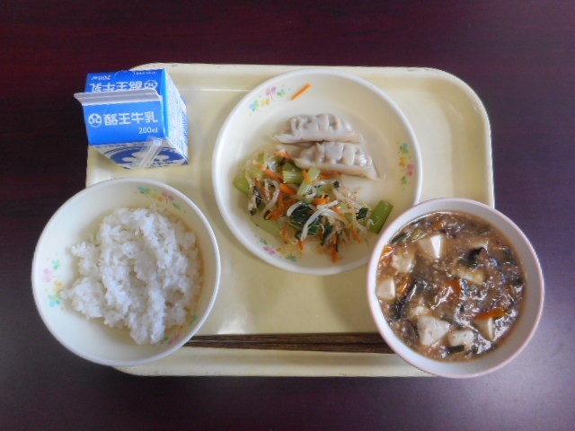 今日の給食の献立は、ご飯、麻婆豆腐、餃子、もやしと小松菜の和え物、牛乳 でした。中華風に味付けられたもやしと小松菜の和え物は、箸休めにぴったりな感じでした。濃厚な麻婆豆腐、餃子、そこにホッとする優しい味付けの和え物、さすがのさじ加減です。調理員さん、今日もありがとうございました。