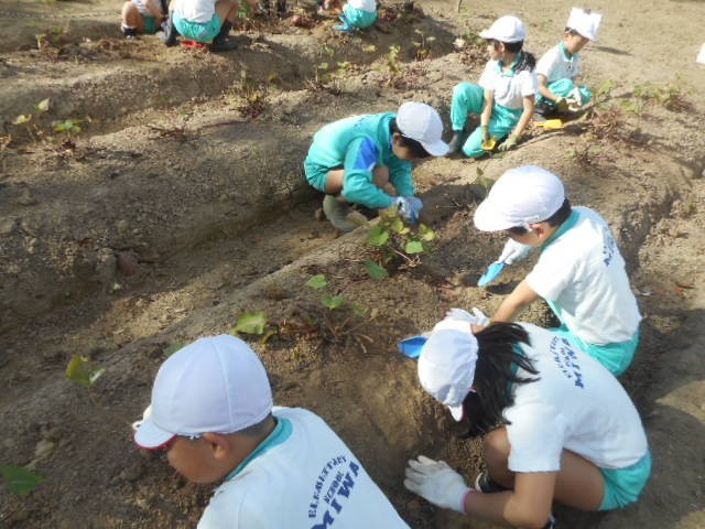 今日は、絶好のいも堀り日和でした。「たくさん掘るぞ!!」と元気に出て行った1年生から3年生の子どもたち。しかし、今年の土は硬かった。最初はプラスチックのシャベルを使っていましたが、これはだめだということで、先生が金属のシャベルを持ってきてくれてました。シャベルを交換して再チャレンジです。先生方もスコップを持ってきて、一緒に掘りました。苦労して掘ったさつまいもはどんな味でしょう。苦労した分、サツマイモが掘れた時の子どもたちの笑顔は最高でした。みんな、あきらめないで最後まで力を合わせてがんばりましたね。