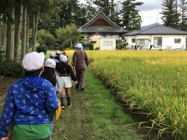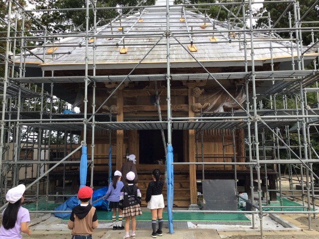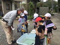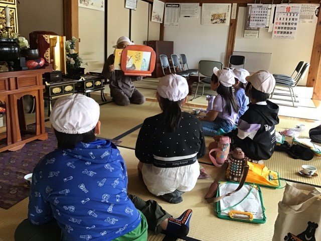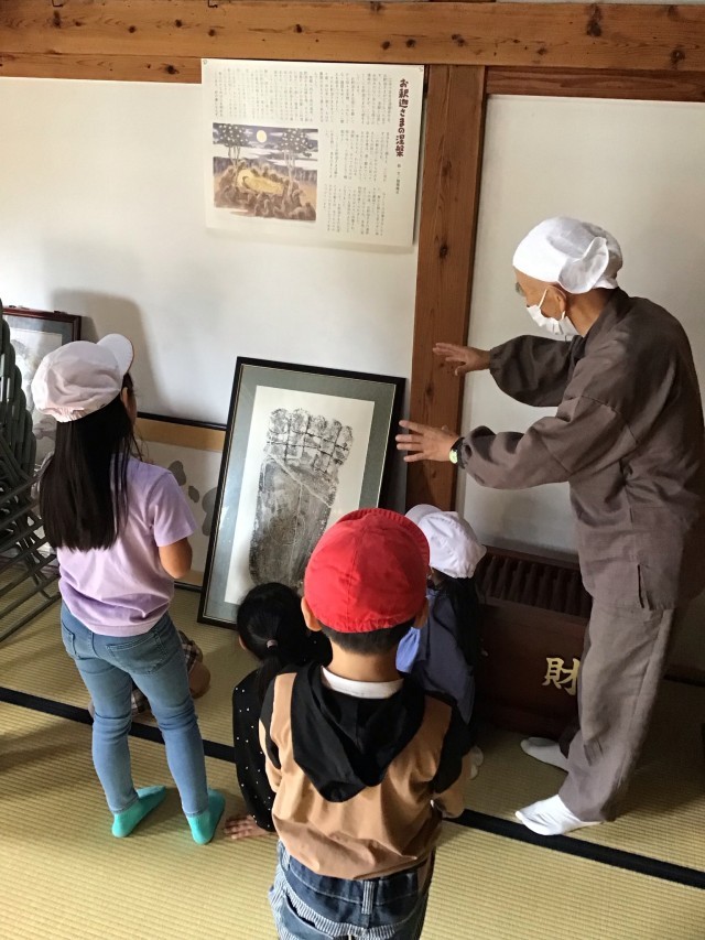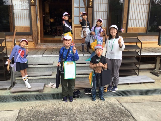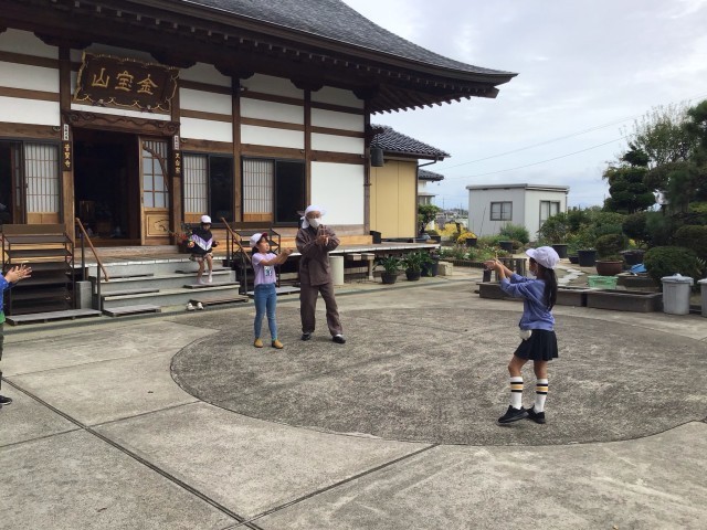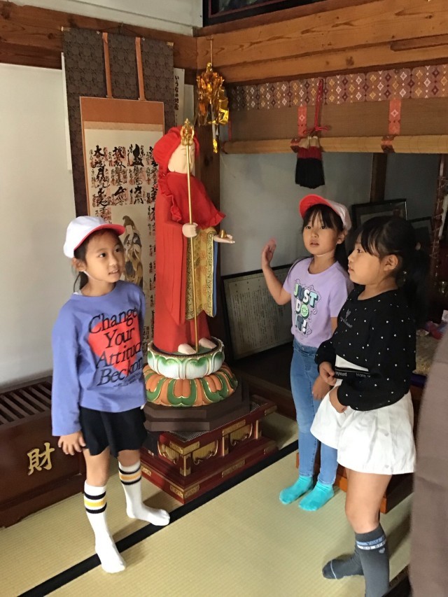 鍋山の普賢寺の和尚さんに案内していただき、鍋山探検に出発です!くじゃくや大きなケヤキの木を見たり、柿の実や栗などの秋探したりしながら鍋山地区を歩きました。「鼻取り地蔵」が祀られているお堂は改修工事のため、お地蔵様を間近で見ることができました!約500年前から鍋山地区にいるお地蔵様で、普賢寺に移されたのは300年くらい前だそうです。他にも興味津々で、和尚さんにたくさん質問しながらいろいろなものを見せてもらうことができました。紙芝居を見たり、竹とんぼで遊んだりする時間もあり、とても楽しい見学となりました。ありがとうございました!!