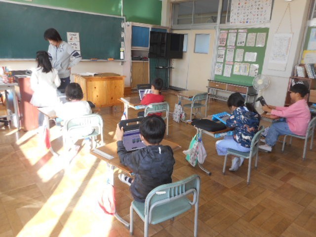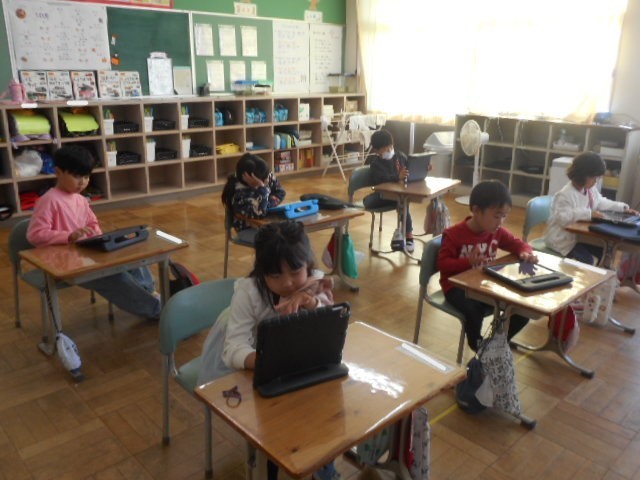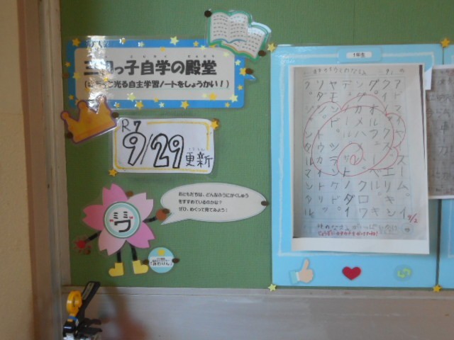 朝の1年生教室の様子です。今日は「はげみ学習」の日です。1年生の三和っ子たちは、それぞれのペースでスタディサプリを使って学習を進めていました。タブレット端末の操作もとてもスムーズにできています。入力したい数字が画面の下にあり、どうしても入力できずに困っている友達がいました。「入力できないんだよな。」と困っていると、「画面を縦にしてみたら!」と友達のアドバイスの声が聞こえました。画面を縦にしたら、入力したい数字がきちんと入力されました。友達同士でアドバイスができるのは、すごいことです。廊下には今まで準備中だった1年生の自学のノートも掲示されました。三和っ子の1年生もがんばっています。