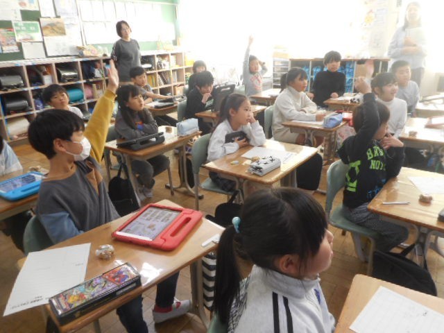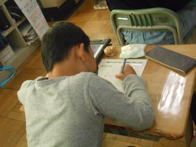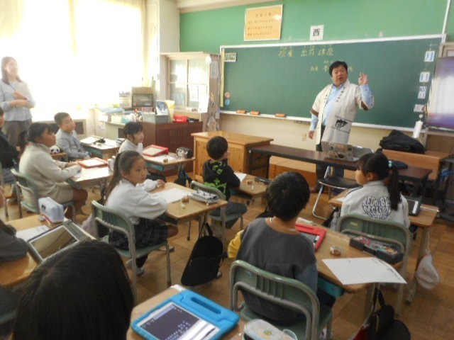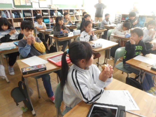 今日は、柏屋社長の本名様においでいただき、出前授業を行いました。子どもたちからは、「どうして柏屋という名前にしたのか。」「お菓子作りで気をつけていることは何か。」「うれしいのはどんな時か。」など様々な質問がでましたが、すべての質問に丁寧に答えていただきました。そして、お客様に喜んでいただくために真心こめてお菓子作りをしていることを、子どもたちは真剣な表情で聞いていました。皆さん、お気づきでしょうか。写真の机の上にあるものがのっています。そうです。お饅頭がのっています。子どもたちは、お饅頭を味わいながらお話を聞かせていただきました。お饅頭を食べた子どもたちは、猛烈な勢いでメモを書いています。これも三和っ子の素敵なところです。そして、大切な力です。とても充実した1時間でした。