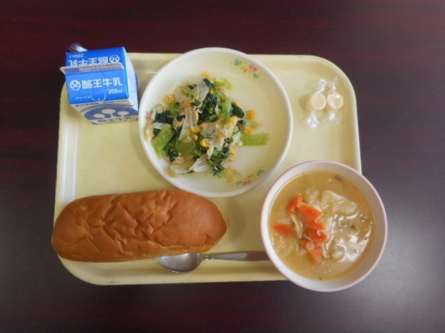 今日の給食は、 アップルパン、かぼちゃ入りすいとん、チキンと小松菜のサラダ、キャンディーチーズ2個、牛乳 でした。すいとんには、かぼちゃが入っていたので、かぼちゃの甘みが優しい味付けとなっていました。サラダは、シャキシャキとした小松菜の食感とさっぱりしたチキンがベストマッチでした。アップルパンも甘味があり、おいしかったです。