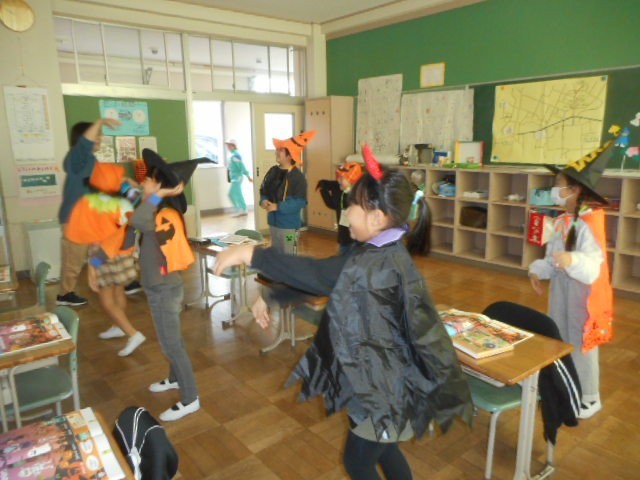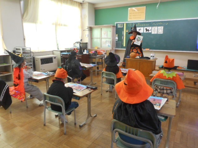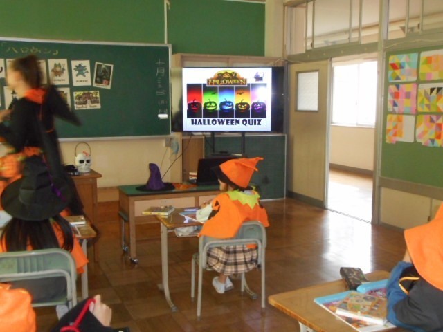 授業の様子を見に行くと、2年生は素敵な衣装に身を包み、英語表現の授業中でした。ハロウィンに関係する英単語を話したり、ハロウィンクイズに挑戦したり、歌を歌ったりと楽しく元気に英語に親しんでいました。ハロウィンで使うかぼちゃ、昔はかぶを使っていたと初めて知りました。クロイ先生も魔女に変身!!ジャックオーランタン模様のスカートが素敵でした。
