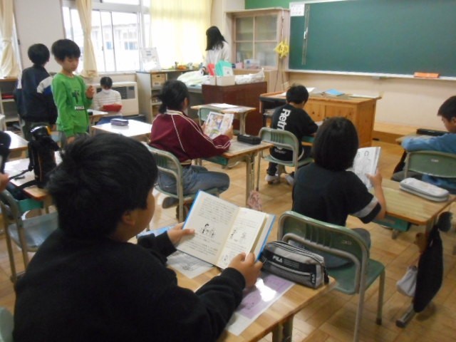 今日の読書タイムの様子です。1年生は、しっかり本を準備して落ち着いて読書に取り組んでいます。他の学年の児童も朝の準備が終わったら、本を読み始めます。2・3年生は、担任の先生による読み聞かせの日でした。子どもたちは、お話の世界に引き込まれています。読書の秋、子どもたちの読書量をどんどん増やしていきたいです。最後の写真は、図書委員の5年生が、「読書郵便」の説明にきた場面です。図書委員会でも三和っ子たちにたくさん本を読んでもらうために、いろいろ企画を考えています。ぜひ、ご家庭でもお子さんと一緒に本のページをめくってみてください。