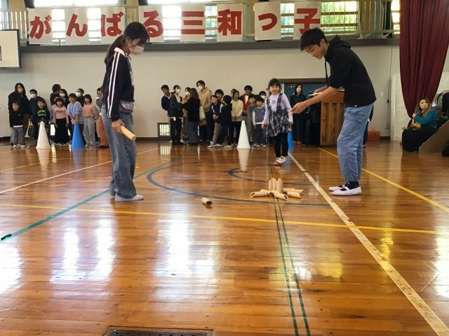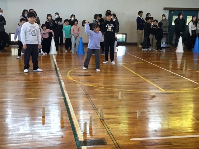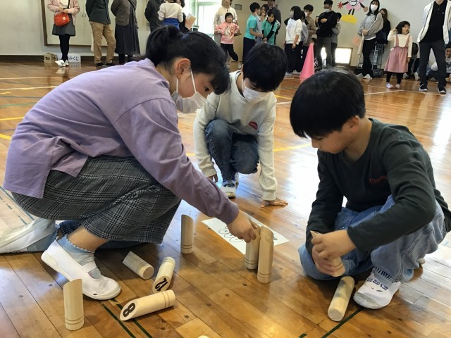 持久走記録会は、風が強すぎたため延期といたしました。代わりに親子モルック大会を行いました。親子で、そしてチームで声を掛け合って、モルックを楽しみました。ここでも6年生が大活躍!!倒れたモルックを直したり、点数を計算したりと、しっかり動いてくれました。ありがとうございます。私は、1本も倒せなかったので、自主練して次回のモルック大会に備えたいと思います。