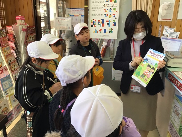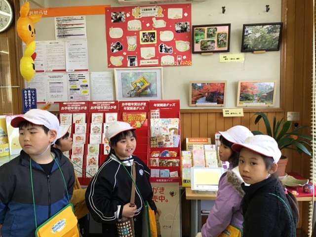 次の行き先は、「三和郵便局」です。郵便ポストが赤い理由や、お手紙は全国各地や外国にも届くこと、ご当地のジュースや食べ物が売っていることなどたくさんのことを知ることができました。郵便局の中には、地域の方が描いた絵や撮った写真なども飾ってありました。昨年度の2年生のお礼のお手紙もありました。地域の方々に愛されている郵便局だということが分かります。たくさんの質問に答えていただき、最後にはお土産もいただきました。ありがとうございました!