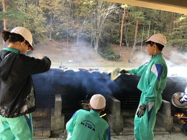 野外炊飯では、「豚汁うどん」を協力して作りました。ごぼうの皮をむくのか?むかないのか?にかなり悩んでいた子どもたち。そして、ごぼうはどう切ればいいのか?各班の判断は様々でしたが、どの班も美味しい豚汁うどんを作ることができました。火をつけるタイミングが早すぎた!というドキドキ感も味わいながら、片付けまで協力して頑張りました。先生方は火を長持ちさせるのに必死でした。最後に、班ごとにまとめの新聞を作りました。時間がなくなってしまい、完成は後日となります。お家に帰ったら、お土産話をたくさんしてください。