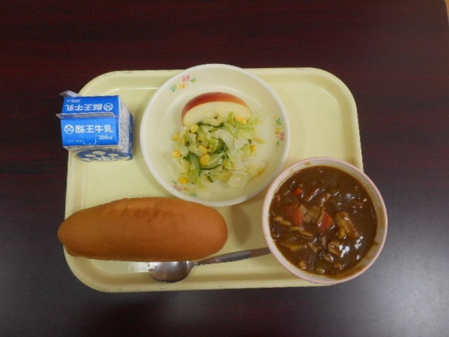 昨日の給食は、コッペパン、マカロニのカレー煮、コーンサラダ、りんご、牛乳でした。
